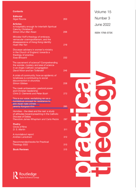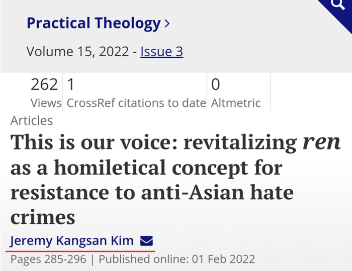 김강산 박사는 프린스톤 신학교가 운영하는 저널(Practical theology, June 2022)에 "This is our voice: revitalizing ren as a homiletical concept for resistance to anti-Asian hate crimes" ("이것이 우리의 목소리: 아시아인 혐오 범죄에 저항하기 위한 설교적 개념으로서 '렌 (仁)'을 되살리기"라는 논문을 게재했다.