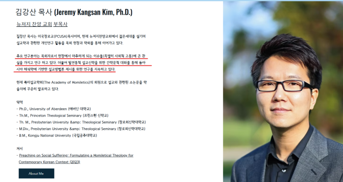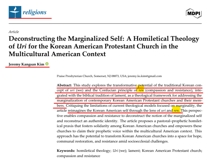 이와 동일한 내용이 종교학 저널에 실린다. 그는 2025년, 16권에 Religions라는 종교학적인 저널에 Deconstructing the Marginalized Self: A Homiletical Theology of Uri for the Korean American Protestant Church in the Multicultural American Context.(소외된 자아의 해체: 다문화적 미국 사회 속 한인 개신교회를 위한 우리(Uri)에 대한 설교학적 신학)이라는 제목으로 논문을 제출한다.