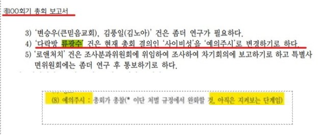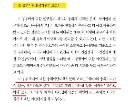 이명범에 대한 100회 이대위 보고서는 "이단성없슴, 해지하기로 하다"였고, 101회 총회는 "이단성없음, 예의주시하기로 하다"였다.