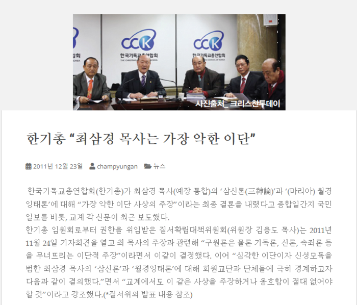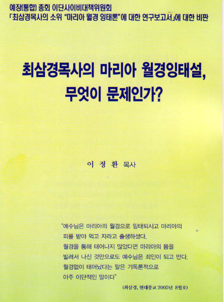 교단에서 김창영목사와 함께 최삼경을 비판하는데 앞장선 인물이다. 결국 한기총에서 최삼경을 이단으로 정죄했다. 이정환목사의 영향이 컸다.