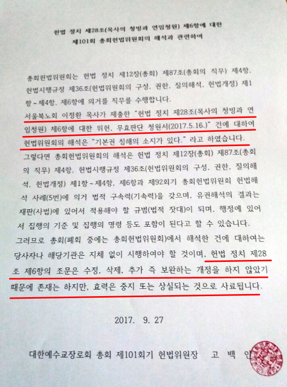 서울북노회 이정환 목사가 제출한 '헌법 정치 제28조(목사의 청빙과 연 임청원) 제6항에 대한 위헌. 무효판단 청원서(2017.5.16.)" 건에 대하여 헌법위원회의 해석은 "기본권 침해의 소지가 있다." 라고 하였습니다.
