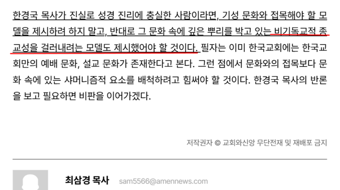 "한경국 목사가 진실로 성경 진리에 충실한 사람이라면, 기성 문화와 접목해야 할 모델을 제시하려 하지 말고, 반대로 그 문화 속에 깊은 뿌리를 박고 있는 비기독교적 종교성을 걸러내려는 모델도 제시했어야 할 것이다."