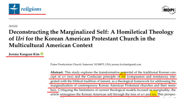 This study explores the transformative potential of the traditional Korean con- cept of uri (we) and the Confucian principle of ren (compassion and resistance), inte- grated with the biblical tradition of lament, as a theological framework for addressing the marginalization of contemporary Korean American Protestant churches and their mem- bers.