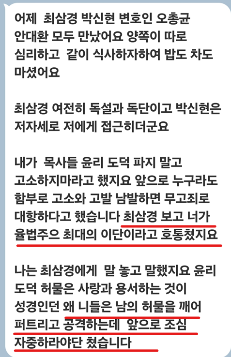 나는 최삼경에게 말 놓고 말했지요 윤리 도덕 허물은 사랑과 용서하는 것이 성경인던 왜 니들은 남의 허물을 깨어 퍼트리고 공격하는데 앞으로 조심 자중하라 야단 쳤습니다."