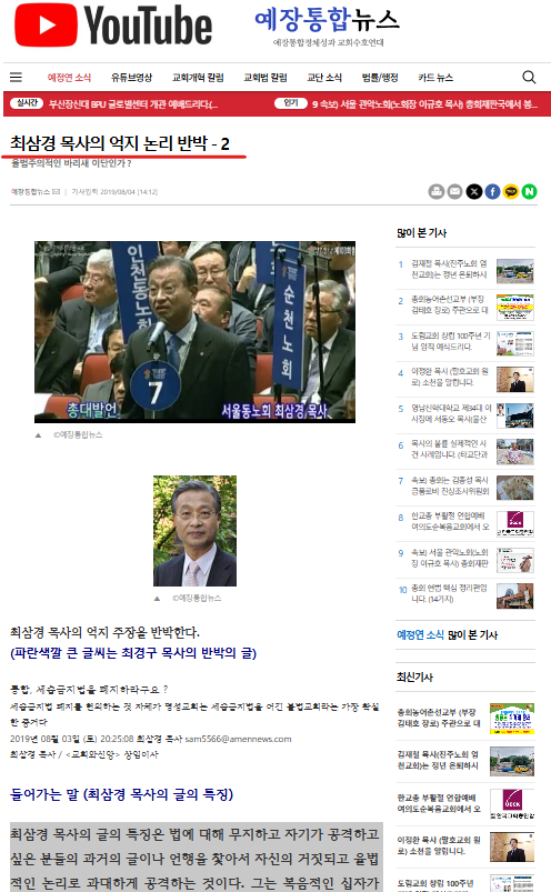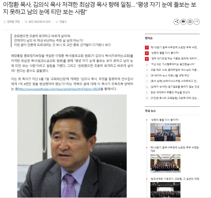 최경구 목사 호통, '최삼경, 네가 율법주의 최대의 이단'이정환목사, "언제까지 남의 뒤나 캐내어 비난하는 추한 삶을 살려고 하는가?"예장통합 은퇴목사들이 최삼경에게 쓴 소리를 하고 있는 것이 드러났다.