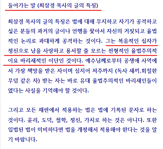 최목사는 2019년 8월 4일자 '최삼경의 억지논리반박'(율법주의적인 바리새인 이단인가?)에서 "그는 복음적인 십자가 정신으로 남을 사랑하고 용서할줄 모르는 전형적인 율법주의적이요, 바리새적인 이단인것이다"라고 말했다.
