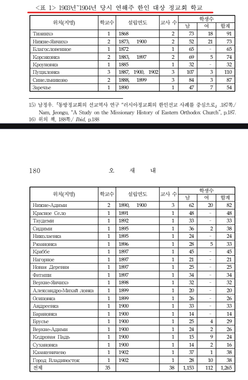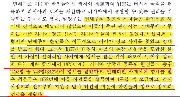외국어대 사학과 반병률교수는 러시아 정교회는 조선인들에게 1869년부터 적극적인 선교횔동을 하여 1872년에는 남우수리주 조선인의 62%가 세례를 받는다고 주장했다. 대부분 신앙보다 정치적인 개인적인 이해관계 때문이었다.