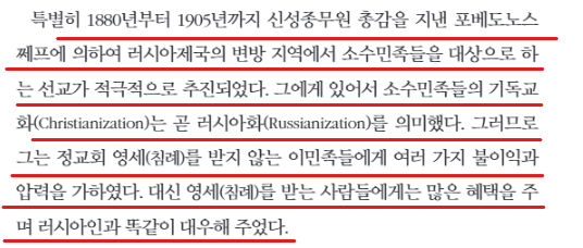 장로회신학대학교에서 러시아 정교회관련 논문으로 박사학위를 받은 남정우 박사는 기독교 사상에 기고한 '러시아정교회의 특성 이해'에서 러시아는 제국의 변방의 소수민족들에 대해서 적극적인 선교를 펼쳤고, 영세를 받지 않는 이민족들은 불이익을 얻었지만 영세를 받는 사람들에게는 많은 혜택이 있었다고 했다.