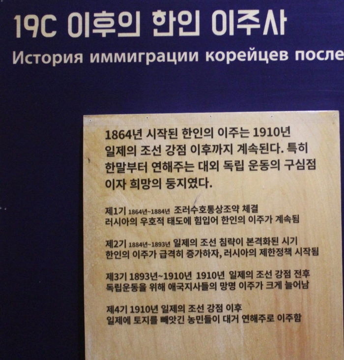 고려인 문화인센터 특히 고려인문화센터에는 연해주의 이주역사와 항일투쟁에 대해서 전시하고 있다. 민족혼이 여전히 살아있다는 것을 보여주고 있다.